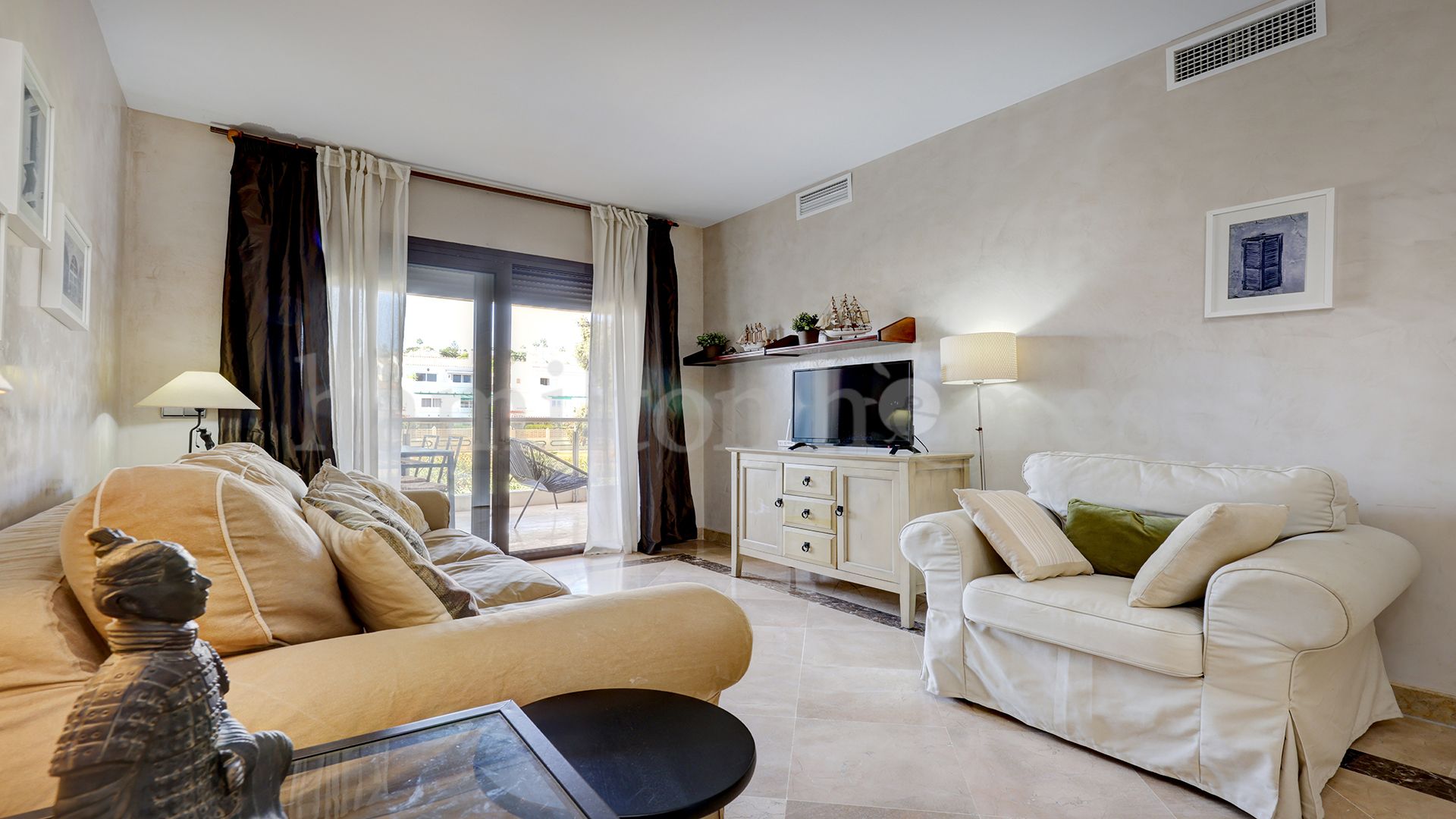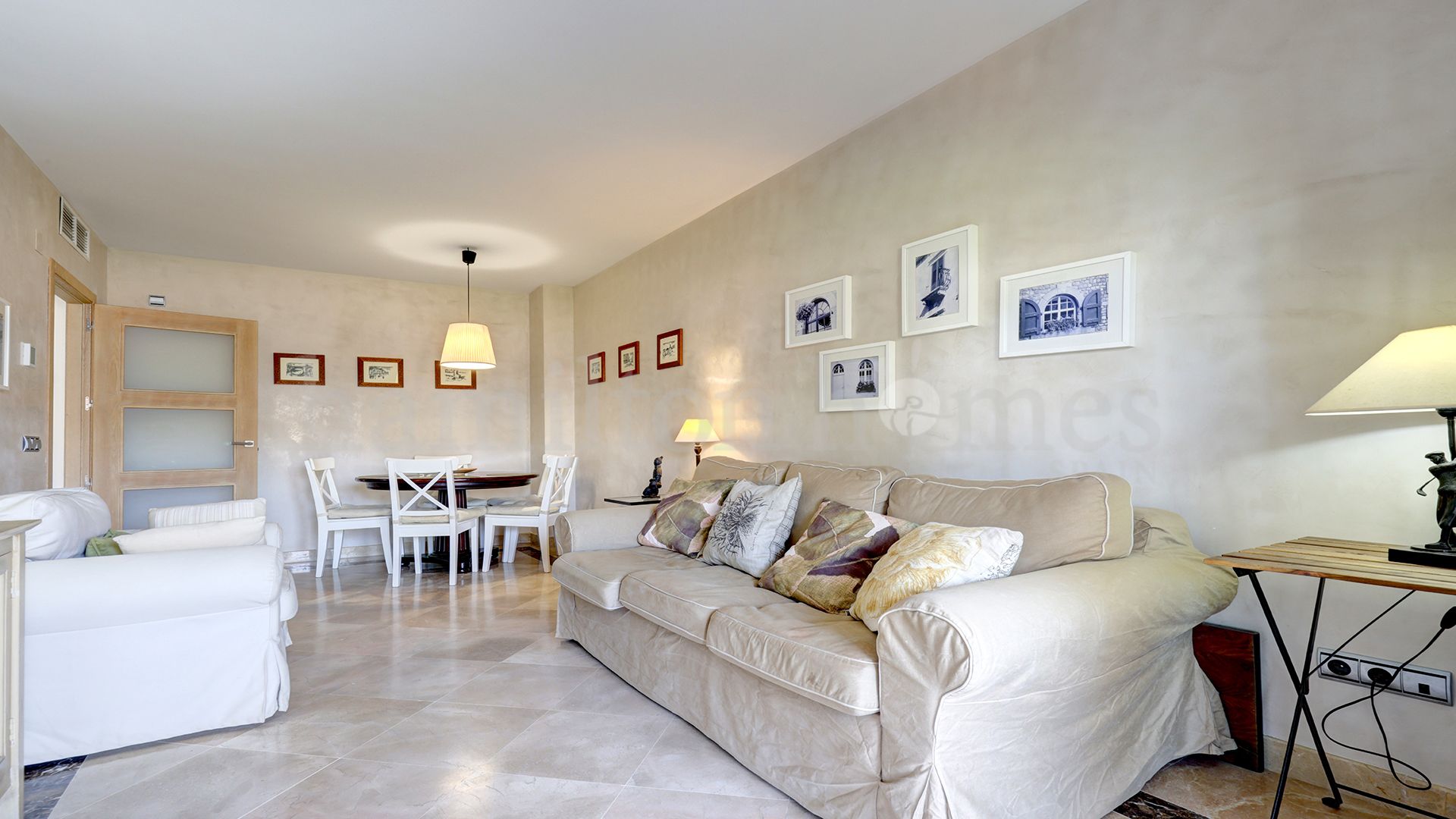 The lounge area currently has lots of natural light emanating from the floor-to-ceiling sliding patio doors providing access to the covered terrace. The terrace has 2 access points 1) from the lounge 2) from the utility room via the kitchen. The terrace provides mountain views and overlooks the Duquesa gardens. The terrace is a lovely setting for al fresco dining, watching the sunsets, or simply relaxing soaking in the Mediterranean lifestyle.