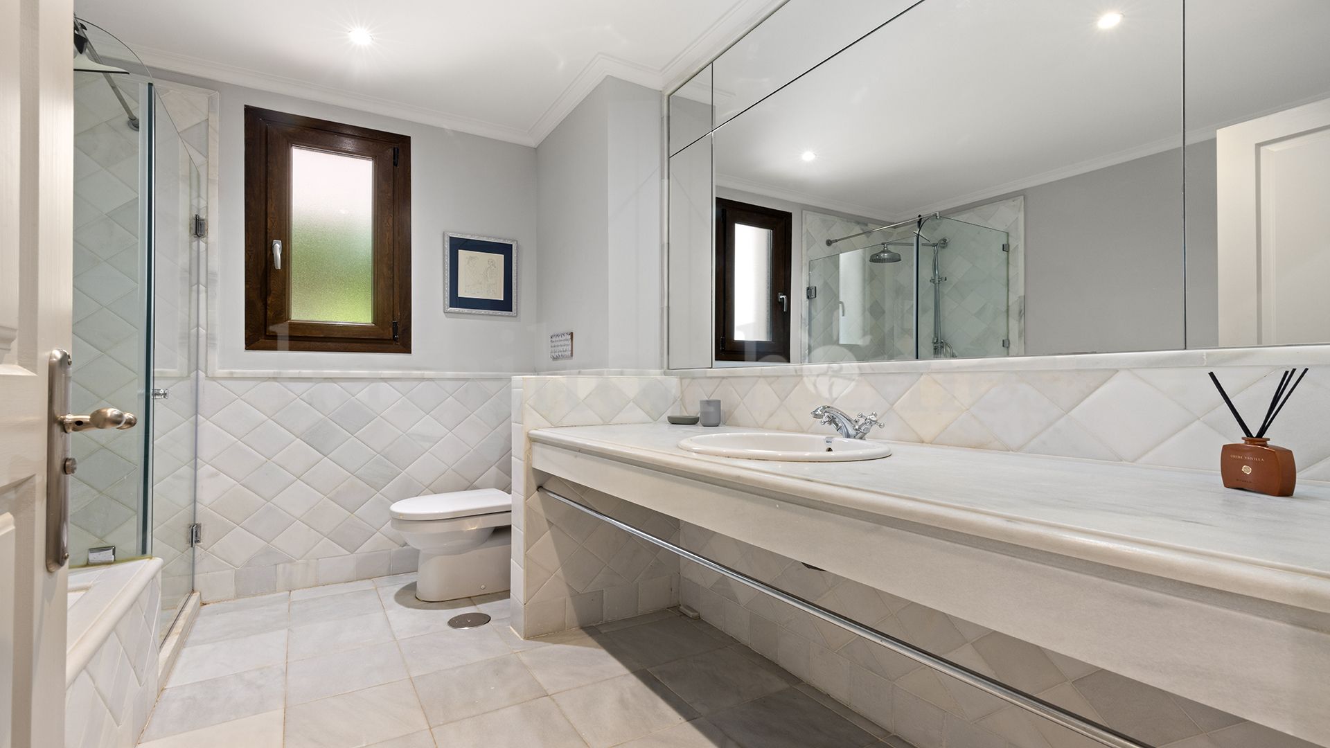 La cocina, totalmente equipada, cuenta además con un práctico lavadero independiente. Los dos baños, acabados en tonos neutros de mármol, disponen de calefacción por suelo radiante, bañera y duchas de obra. El dormitorio principal se abre directamente a la terraza, creando un refugio ideal, mientras que el segundo dormitorio también tiene acceso directo al jardín. El tercer dormitorio es versátil y puede adaptarse como habitación de invitados, cuarto infantil o despacho.
