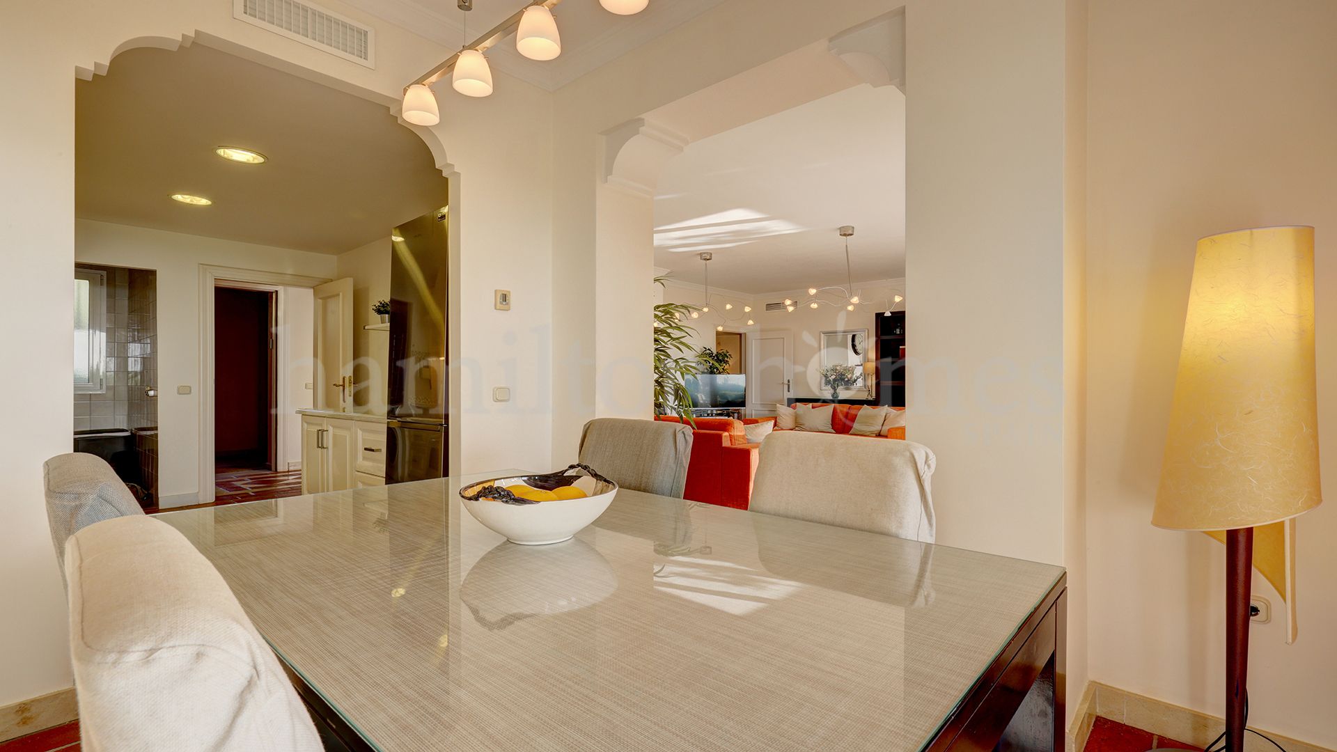 La cocina, totalmente equipada, se comunica tanto con el comedor como con el hall de entrada y cuenta con un lavadero independiente. Los tres dormitorios son amplios, todos con armarios empotrados y acceso directo a la terraza. La suite principal incluye un lujoso baño con jacuzzi, mientras que los otros dos dormitorios resultan ideales para familiares, invitados o incluso despacho.