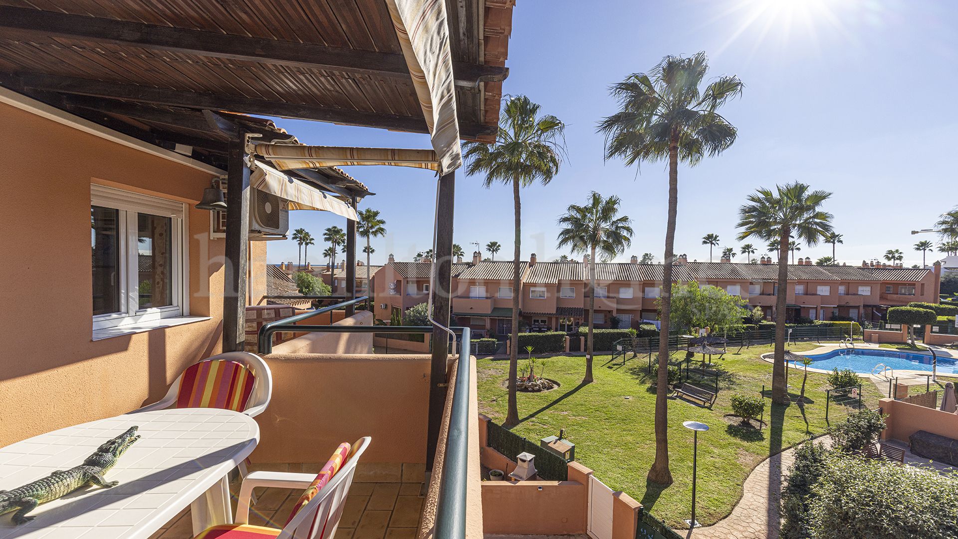 Al entrar en la vivienda se accede directamente al salón comedor. A la derecha hay un balcón muy agradable con vistas abiertas a las piscinas y jardines, con espacio suficiente para una mesa de cuatro a seis personas. La propiedad también dispone de cocina independiente, un dormitorio amplio y un baño.